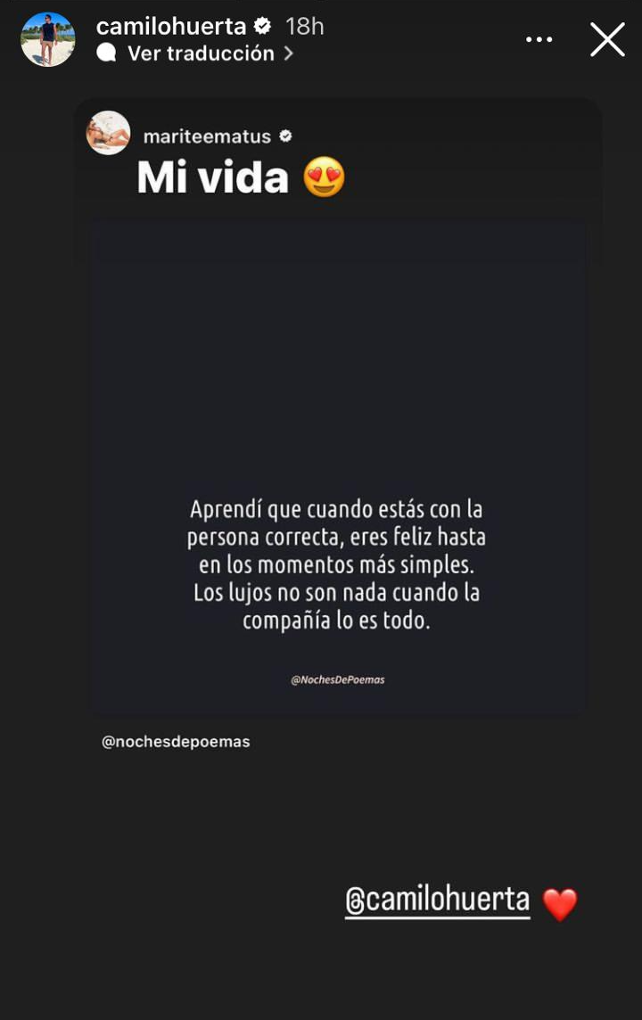 Ha pasado tiempo de la separación entre María Teresa Matus y Arturo Vidal. Su nueva vida la mantiene completamente renovada, dedicando gran parte de su tiempo a su familia, al trabajo, pero sin duda también a su nuevo amor, Camilo Huerta. Marité, quien siempre pasa muy activa en redes sociales, no tuvo miedo en demostrar su amor por el profesor de educación física. Es por esto que, María Teresa aprovechó de dedicar una romántica historia de Instagram demostrando su amor. "Aprendí que cuando estás con la persona correcta, eres feliz hasta en los momentos más simples", partió el texto que dedicó Marité. "Los lujos no son nada cuando la compañía lo es todo", concluyó la dedicatoria. La estrecha relación entre Huerta y los hijos de Marité, ha demostrado que la pareja se encuentra fortaleciéndose cada vez más.