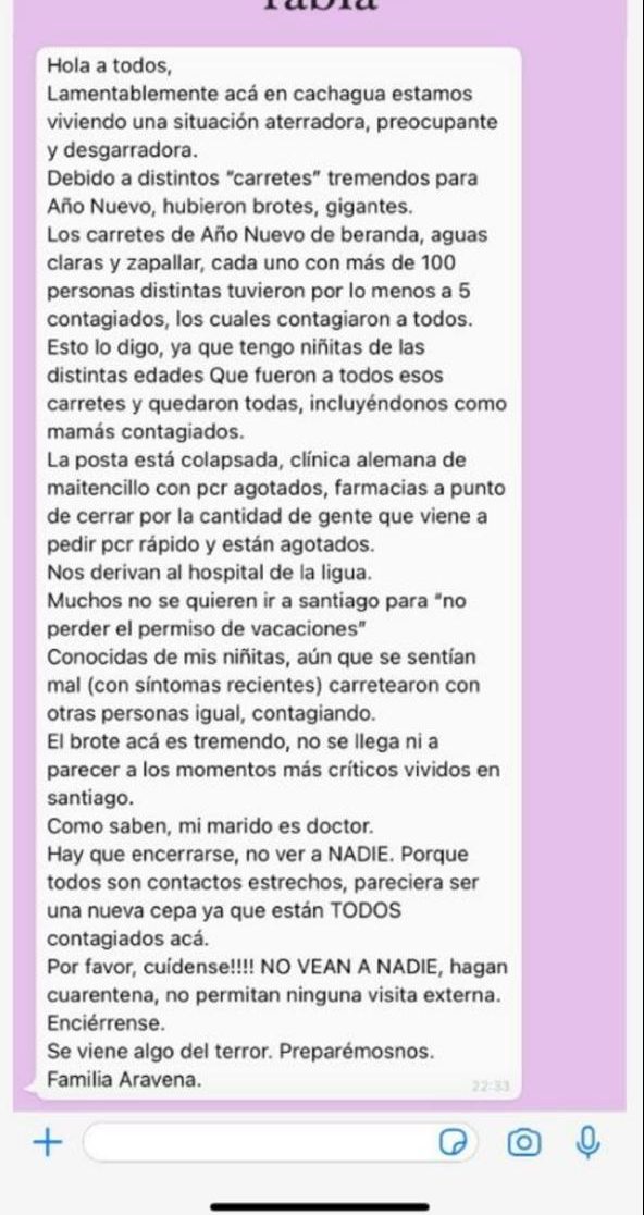 Lee también: COVID-19: Revisa las comunas que cambiarán de fase en el Plan Paso a PasoEn una de las viralizaciones, una madre expresa su preocupación: “nos derivan al hospital de La Ligua. Muchos no se quieren ir a Santiago para ‘no perder el permiso de vacaciones’. Conocidas de mis niñitas, aunque se sentían mal, con síntomas recientes, carretearon con otras personas igual, contagiando".