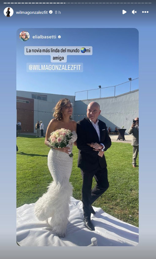 personal trainer lució un ceñido vestido de novia blanco con corte sirena, el cual en su zona inferior estaba cubierto de finas plumas.