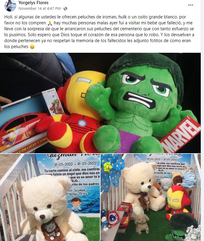 Yorgelys Flores acudió a redes sociales para denunciar este hecho, haciendo un llamado a las personas a no comprar los recuerdos que tenía para su hijo en el cementerio de Antofagasta. "Ya no respetan la memoria de los fallecidos", escribió.