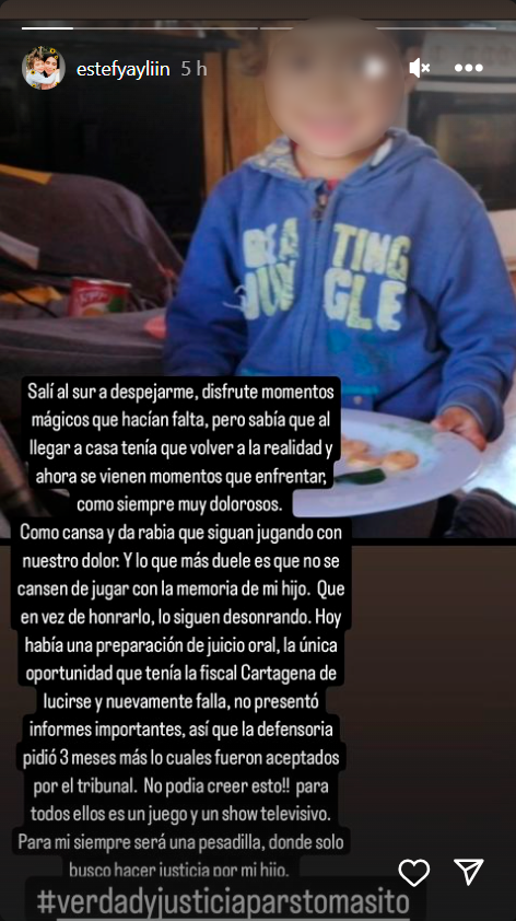 Estefanía Gutiérrez realizó un duro descargo en su cuenta de Instagram luego que Fiscalía reprogramara el juicio contra Jorge Escobar por petición del defensor regional. "No se cansan de jugar con la memoria de mi hijo", expresó.
