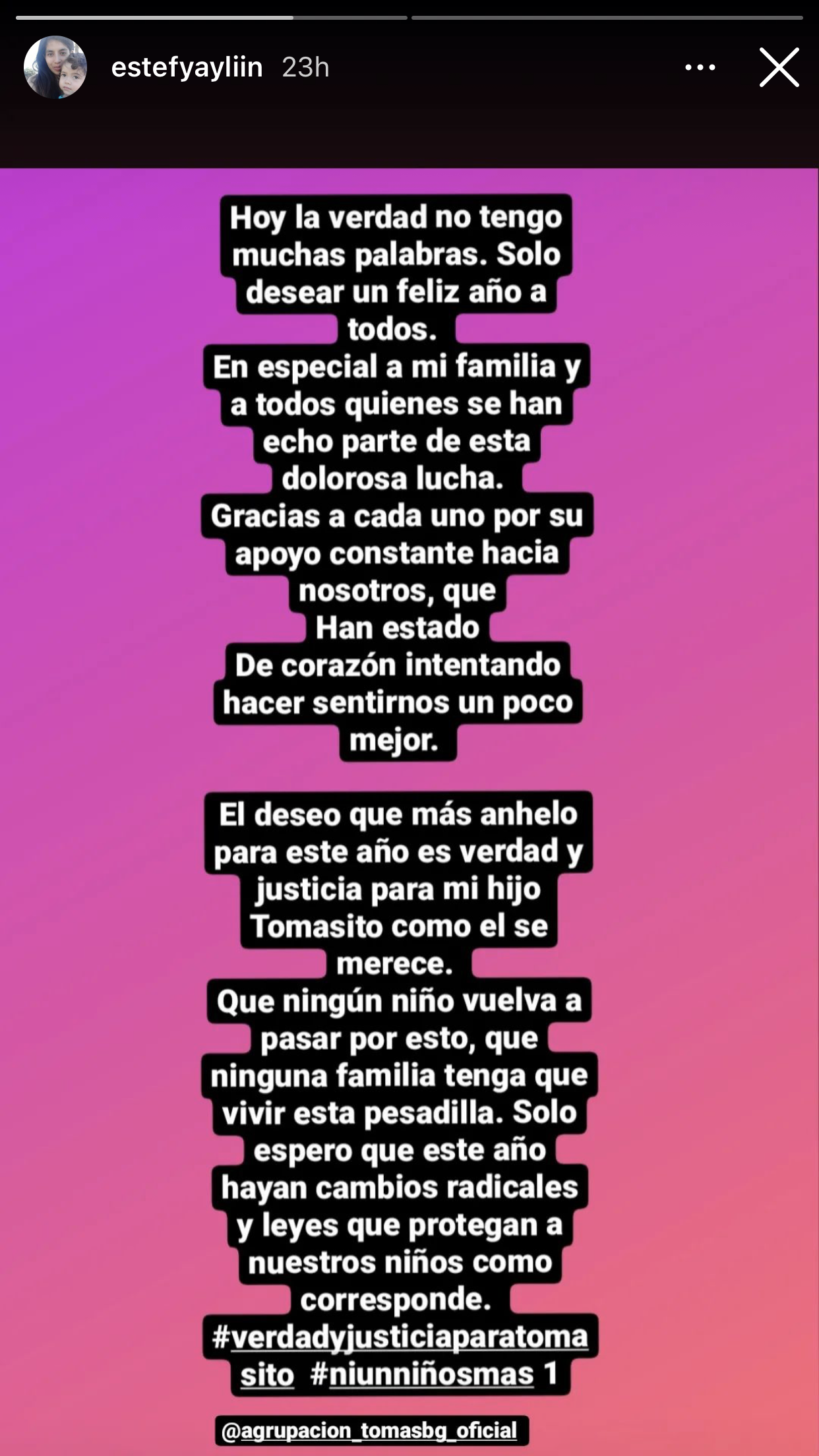 A través de sus redes sociales, Estefanía Gutiérrez reveló sus mayores deseos para este año 2022. "Que ningún niño vuelva a pasar por esto, que ninguna familia tenga vivir esta pesadilla", señaló.