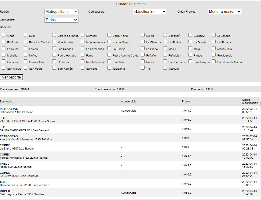 Por ejemplo, en una búsqueda rápida hecha en la Región Metropolitana, aparece que la bencina de 95 octanos más barata está en Peñaflor, Quinta Normal y San Bernardo. En el caso de la Región de Valparaíso, los precios más baratos de ese mismo combustible, se encuentran en servicentros de Valparaíso, Llaillay y Calera.