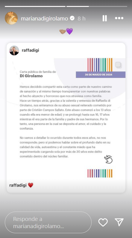Cabe recordar que la actriz es prima de Raffaella di Girolamo, hija de Claudia di Girolamo, quien es tía de Mariana. En la storie, Mariana puso un emoji de dos manos y un corazón de color morado junto a la carta pública de su prima Di Girolamo. Además, no ha sido la única que ha tomado postura frente a la acusación. Las últimas horas también lo hizo la actriz Josefina Montané, pareja Pedro Campos, hijo de Cristián Campos.
