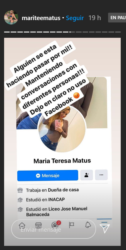 Lee también: Lisandra Silva responde a críticas tras vestir a su hijo de rosado: "¿Todavía con esos prejuicios en el 2020?""Alguien se está haciendo pasar por mí!! Manteniendo conversaciones con diferentes personas!!! Dejo en claro no uso Facebook", escribió Matus en sus historias de Instagram.