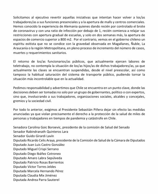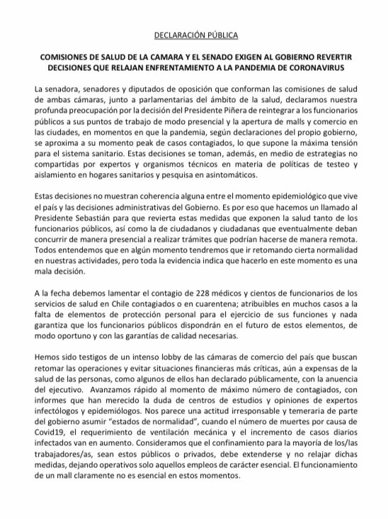 A través de una declaración pública, los parlamentarios expresaron que “estas decisiones no muestran coherencia alguna entre el momento epidemiológico que vive el país y las decisiones administrativas del Gobierno”.