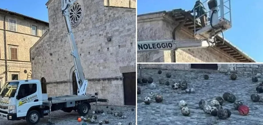 La imagen fue capturada frente a la parroquia de San Tommaso en el centro de Ascoli Piceno. En ella, se muestra como una grúa con un trabajador están limpiando la parte superior del inmueble, hallando balones antiguos principalmente del siglo 20.