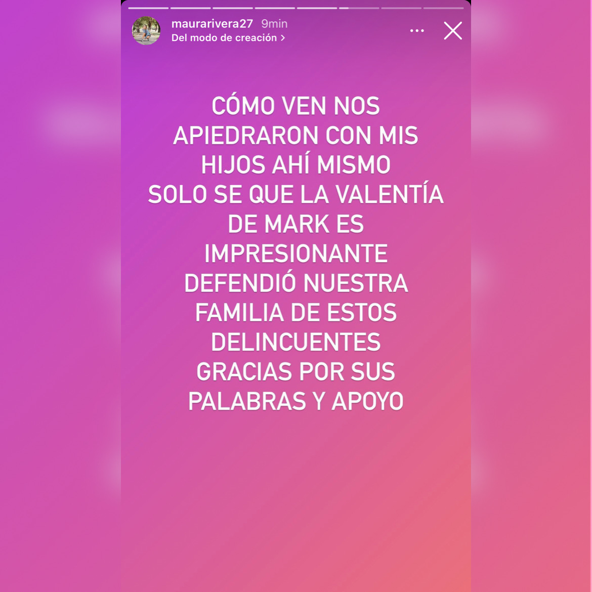 Lee también: "Me fue arrastrando todo el trayecto": Violento asalto a adulta mayor en Viña del Mar para robarle su mascotaPosteriormente, volvió a compartir registros sobre el suceso. Esta vez, en las historias de Instagram, se puede ver el momento en que un hombre lanza una piedra hacia el sector donde Maura Rivera estaba grabando con su celular. En tanto, otros individuos gritan groserías.