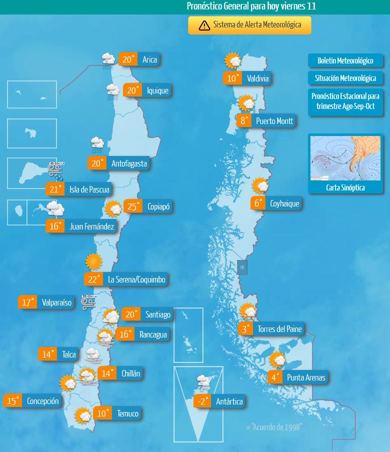 En regiones, el pronóstico para este viernes 11 de agosto se mantendrá con temperaturas sobre los 20° hacia el norte, en ciudades como Copiapó y La Serena, mientras que hacia el sur habrá una baja en los termómetros con 10° en Temuco y Valdivia.