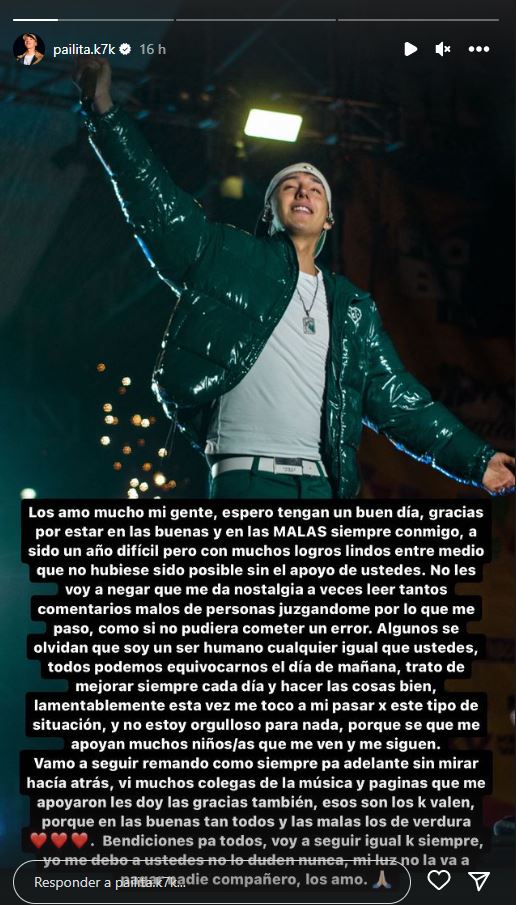 Luego, Pailita se refirió a los comentarios negativos: "No les voy a negar que me da nostalgia a veces leer tantos comentarios malos, de personas juzgándome por lo que me pasó, como si no pudiera cometer un error. Algunos se olvidan que soy un ser humano cualquiera, igual que ustedes", escribió.