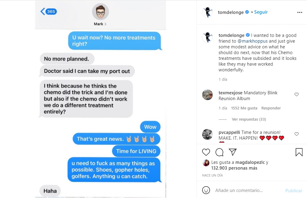 El encargado de dar la noticia fue su ex compañero de banda, Tom DeLonge, quien usó sus redes sociales para publicar capturas de pantalla en que su amigo le contaba que finalizó el tratamiento con éxito.