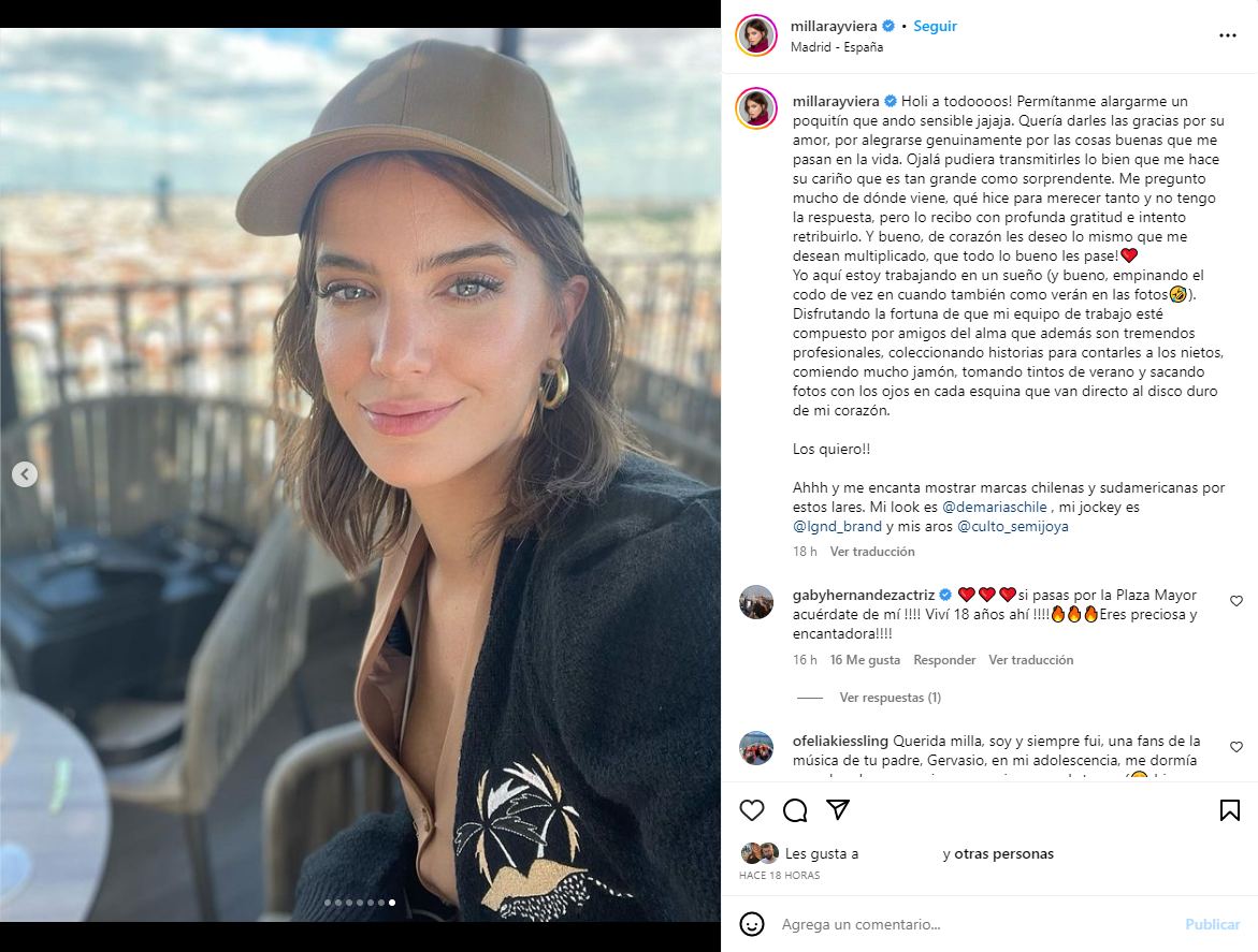 equipo de trabajo esté compuesto por amigos del alma, que además son tremendos profesionales". "(Estoy) comiendo mucho jamón, tomando tintos de verano y sacando fotos con los ojos que van directo al disco duro de mi corazón", concluyó.