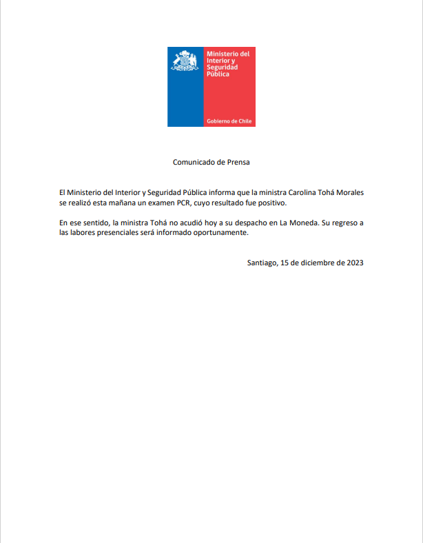 "El Ministerio del Interior y Seguridad Pública informa que la ministra Carolina Tohá Morales