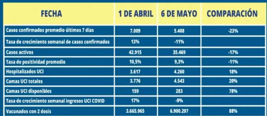 Por ejemplo, entre los datos comparados destacan los casos confirmados promedio de los últimos 7 días (de las fechas mencionadas): 7.009 (al 1 de abril) y 5.408 (al 6 de mayo).