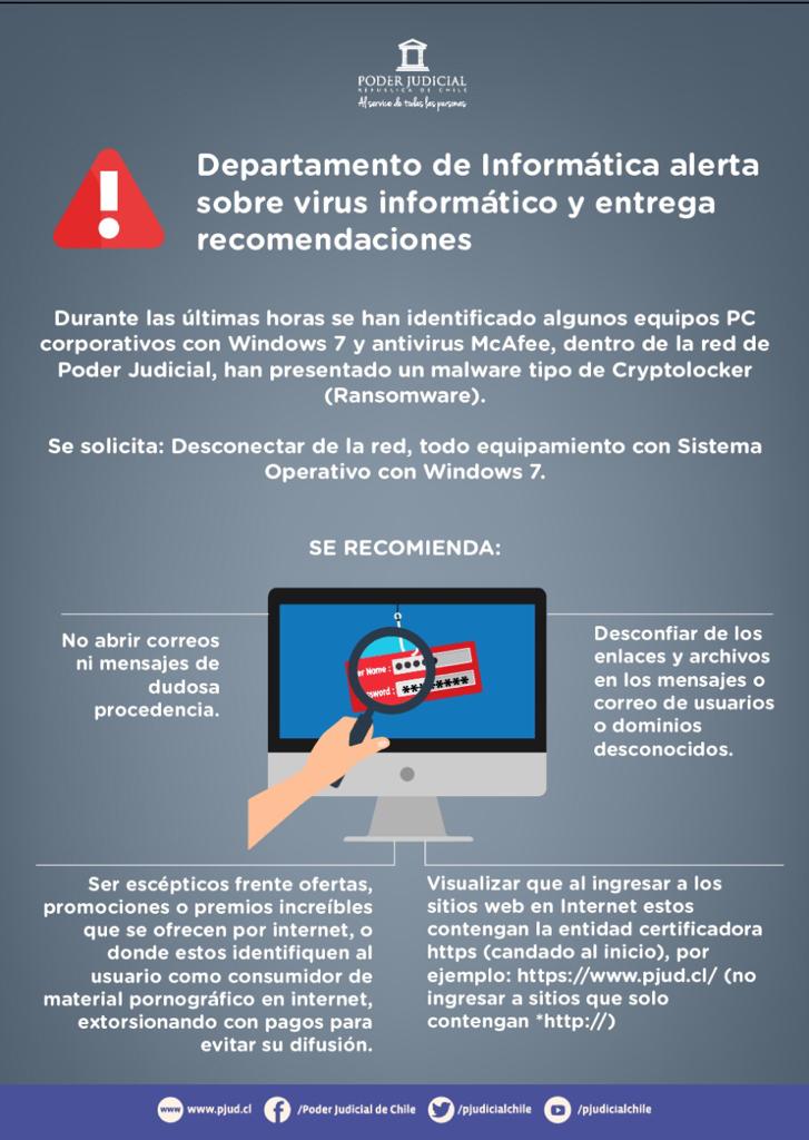 Se trata de un "malware" conocido como Crytolocker que deja inutilizado los computadores donde se expande. Relatores de la Corte de Santiago revelaron pérdida de archivos. La noticia llegó rápidamente a la Defensoría que ordenó que -por ningún motivo- abran correos provenientes de la judicatura.