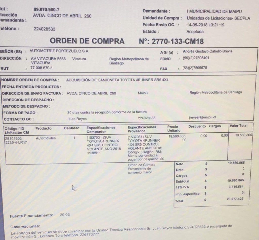 El 14 de mayo del año pasado, la municipalidad de Maipú realizó una compra a la automotora Portezuelo S.A (de Vitacura). Se trataba de una camioneta Toyota 4 Runner, modelo 4x4, año 2018.