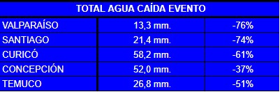 Desde las fiestas patrias de 2018, cuando cayeron 22,9 milímetros, que Santiago no recibía una lluvia tan cuantiosa como la que se produjo durante la madrugada y la mañana de este viernes 12 de junio. Según el registro de la Dirección Meteorológica, en Quinta Normal, se acumularon 21,4 milímetros durante el evento.Hubo sectores que superaron los 40 milímetros en la Región Metropolitana, como Talagante, por ejemplo, yzonas cordilleranas con más de 50 centímetros de nieve. Pese a las precipitaciones, en la capital persiste el déficit (-74%) a la fecha, lo mismo que en gran parte del país.Lee también: Con este mapa gratuito podrás ubicar dónde venden la parafina más barata por comunaEn Valparaíso cayeron poco más de 13 milímetros (Armada) en el borde costero, mientras que en las alturas de Rodelillo (DMC) acumularon 40,7 y en Quilpué (Red Meteo Aficionada) sumaron 45,3 milímetros.