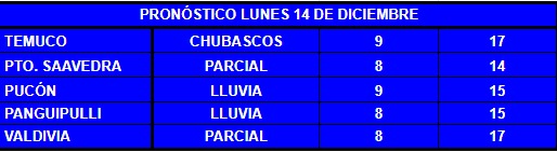 En cuanto al pronóstico del tiempo para este lunes 14 de diciembre, el día del eclipse total de sol, persiste la opción de precipitaciones matinales en las provincias de Cautín y Valdivia, lugares en el que se producirá la oscuridad total.