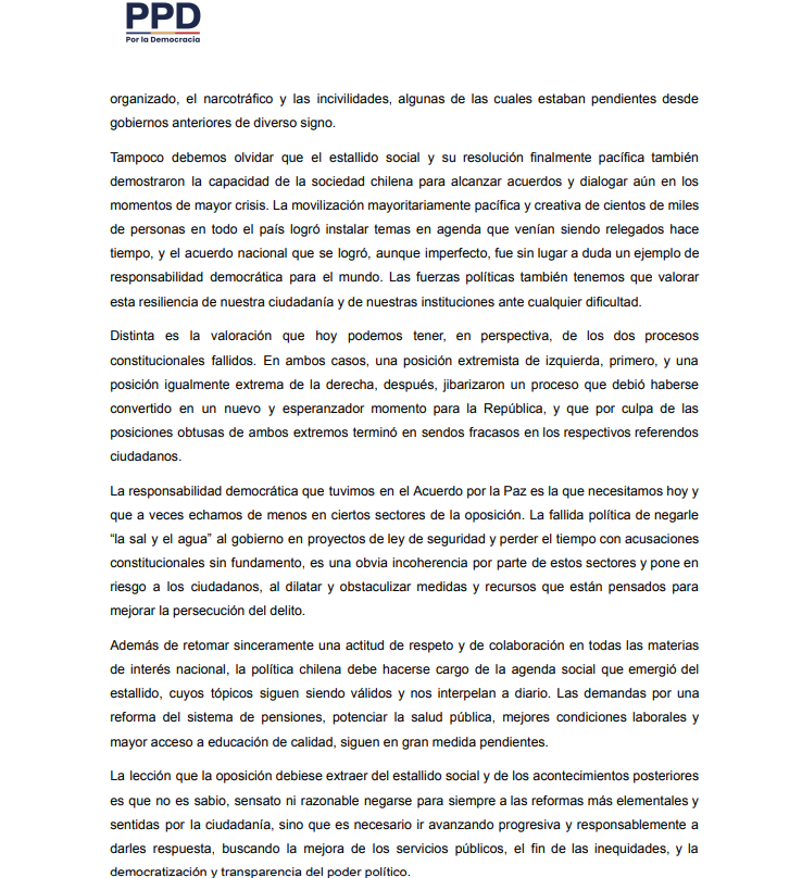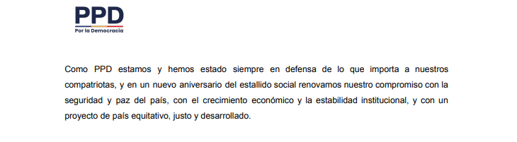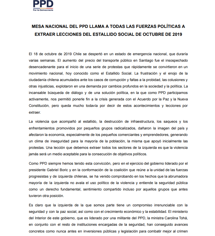 El Partido por la Democracia (PPD) hizo un llamado a "todas las fuerzas políticas a extraer lecciones del estallido social de octubre de 2019".