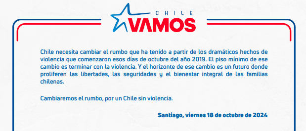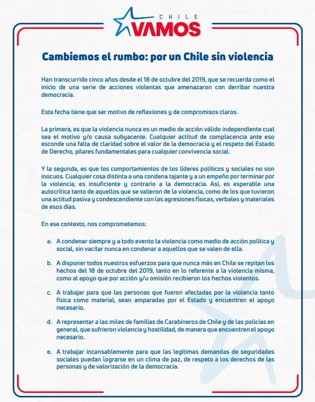 "Chile necesita cambiar el rumbo que ha tenido a partir de los dramáticos hechos de violencia que comenzaron esos días de octubre del año 2019", indicaron.