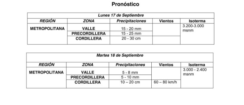 Junto a #OnemiRM hemos declarado #AlertaTempranaPreventiva para la #RMdeTodos x sistema frontal a partir de hoy y hasta q las condiciones lo ameriten. Infórmate sobre esta medida q busca mantener preparados todos los recursos técnicos y humanos en caso d emergencia. pic.twitter.com/bMTiWmOMhG— Intendencia RM (@IntendenciaRM) September 16, 2018