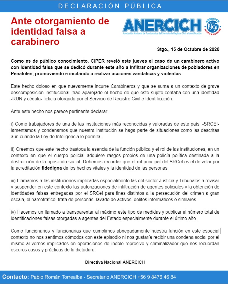 En tanto, la Asociación Nacional de Funcionarios del Servicio de Registro Civil e Identificación (Anercich) condenó que la institución “se haga parte de situaciones como las descritas, aún cuando la Ley de Inteligencia lo permita”.