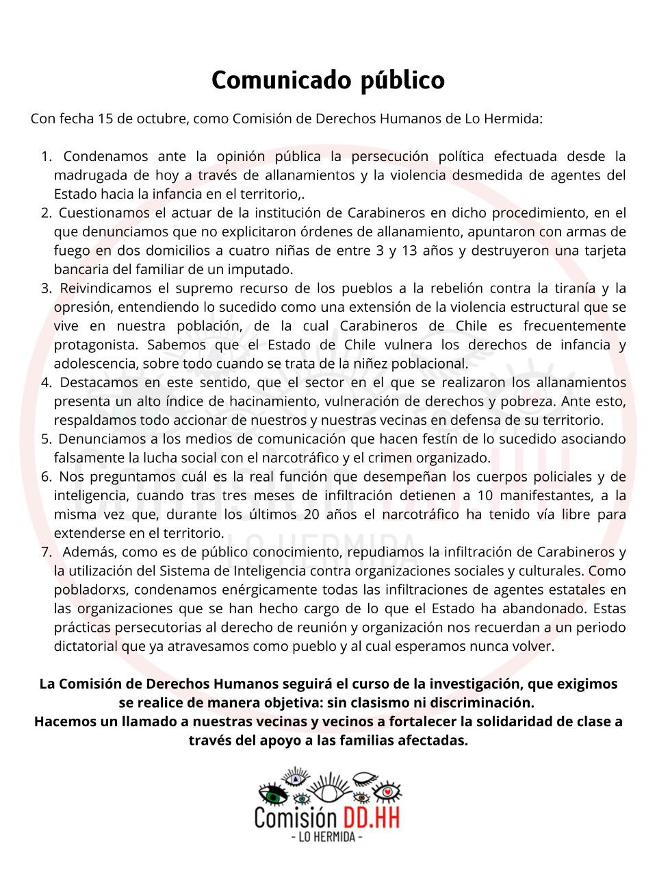 Por su parte, la Comisión de DD.HH. de Lo Hermida manifestó que "repudiamos la infiltración de Carabineros y la utilización del Sistema de Inteligencia contra organizaciones sociales y culturales".