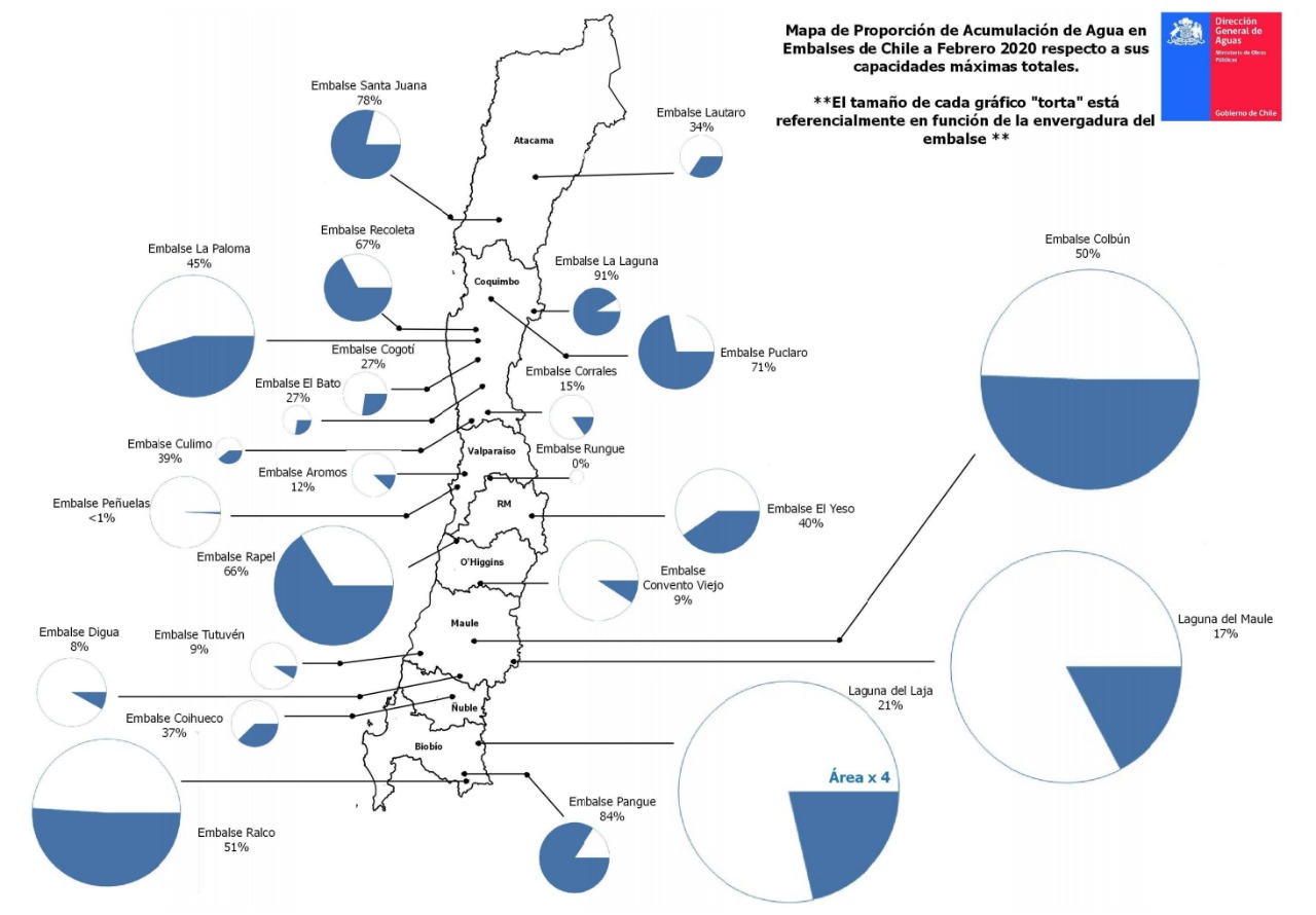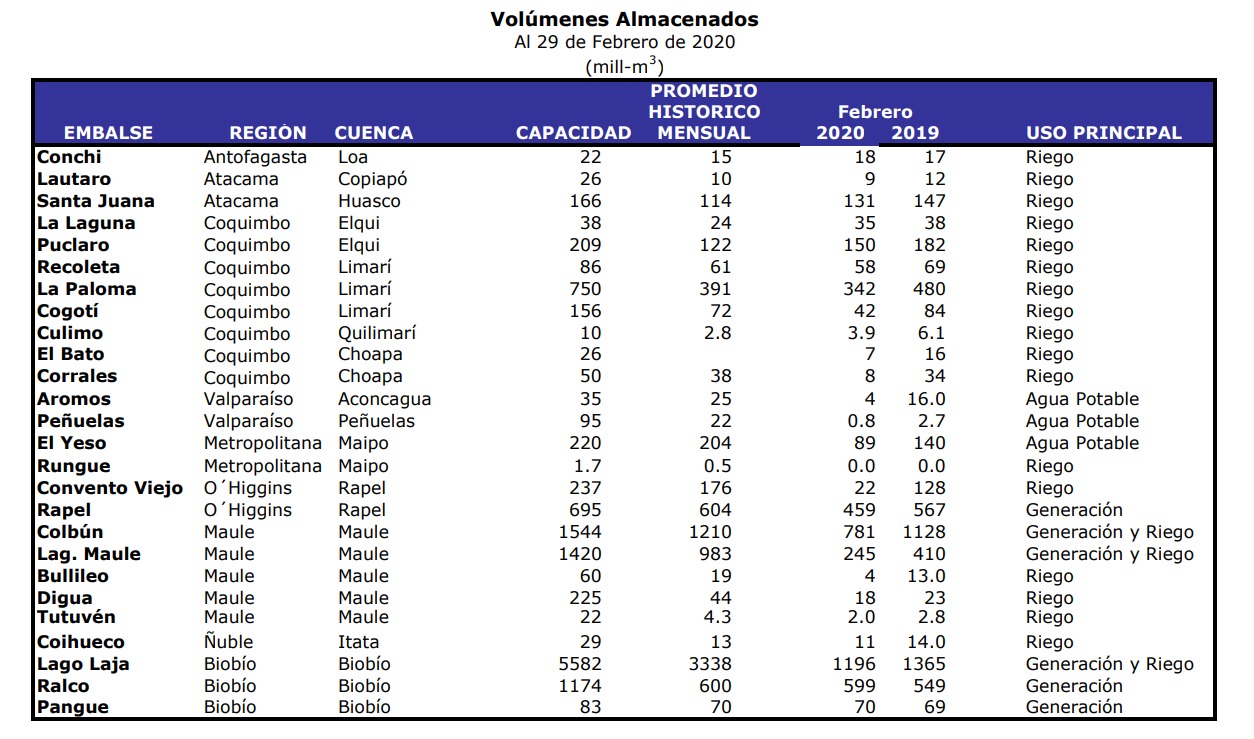 Hasta febrero de 2020, el volumen de agua almacenada en el país corresponde al 33% de la capacidad total. Tal cual, el agua ocupa un tercio de los embalses destinados a su acaparamiento desde Atacama hasta Bío Bío, aunque hay casos puntuales que resultan dramáticos.