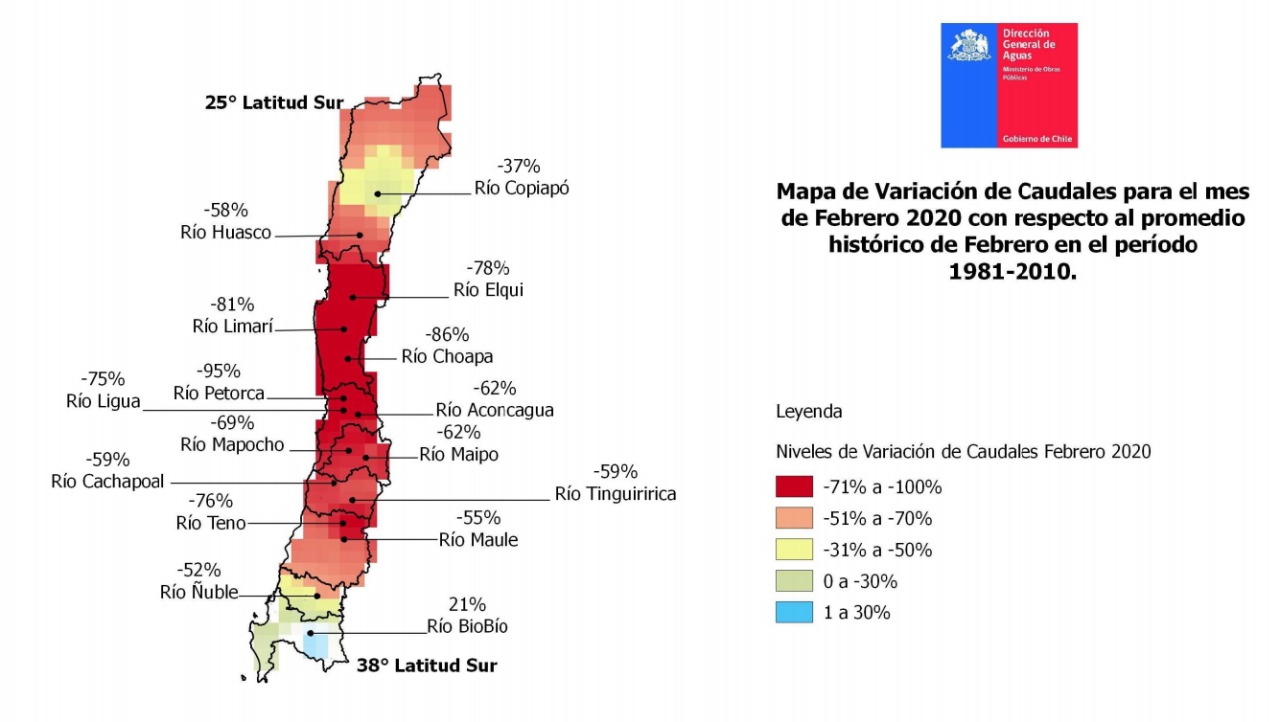 El caudal de los ríos también sigue a la baja. De acuerdo con los datos de la Dirección General de Aguas, “sólo el caudal del Biobío se mantiene por sobre su promedio. El resto de los ríos están por debajo de sus promedios y, en la mayoría de los casos, por debajo de su mínimo histórico o muy cercano a él. En relación con el año pasado, los caudales actuales son todos menores, salvo el río Huasco”.