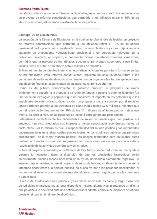 La Superintendencia de Pensiones inició un proceso sancionatorio contra la AFP Habitat por la carta difundida a sus afiliados en que califica al proyecto de retiro del 10% de los fondos de "populista" y de buscar "destruir el sistema previsional".
