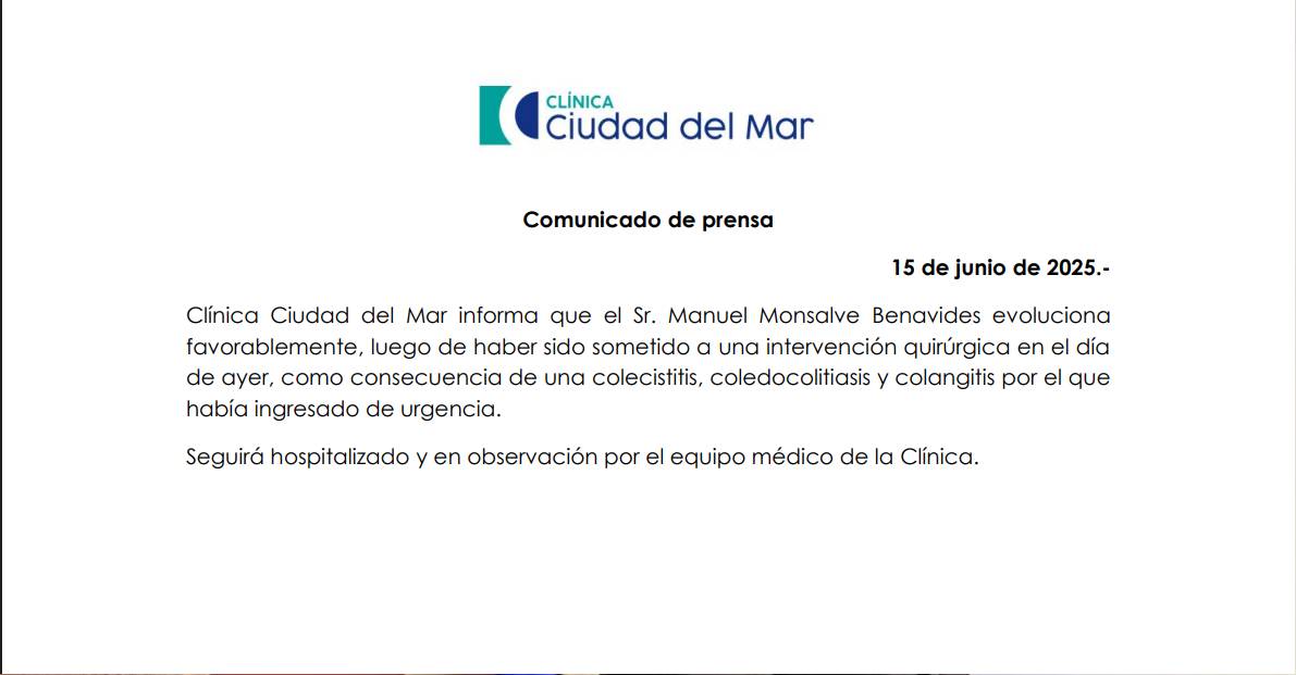 La clínica Ciudad del Mar, en Viña del Mar, actualizó el estado de salud de Manuel Monsalve, quien fue internado e intervenido quirúgicamente el sábado 14 de junio debido a un "cuadro agudo".