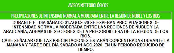 El primer día de agosto se “esperan precipitaciones de intensidad normal a moderada (entre 15 y 45 milímetros) entre las regiones de Ñuble y La Araucanía, además, de sectores en la precordillera de Los Ríos”, afirma la DMC. Según el organismo, estas lluvias “estarán concentradas durante la mañana y la tarde del sábado en un periodo reducido”.