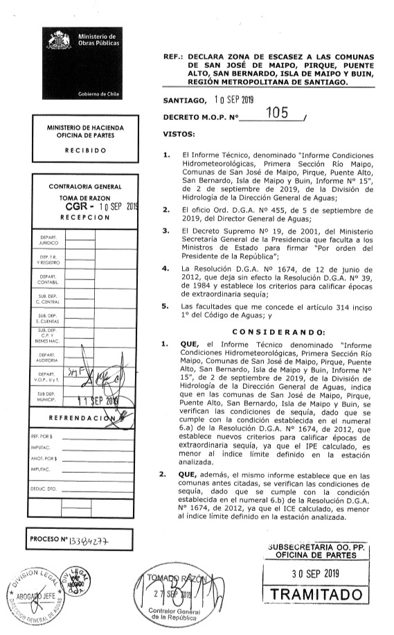 “Sí, ya se solicitó una prórroga. Esto ha sido útil para que la Junta de Vigilancia del Maipo pueda privilegiar el consumo humano. De esta forma se ha podido usar un poco más de caudal habitual del Maipo. Agradezco la buena disposición de la Junta de Vigilancia para priorizar el consumo humano”.