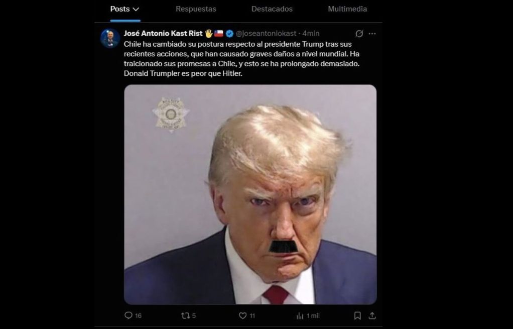 “Chile ha cambiado su postura respecto al presidente Trump tras sus recientes acciones, que han causado graves daños a nivel mundial. Ha traicionado sus promesas a Chile, y esto se ha prolongado demasiado. Donald Trumpler es peor que Hitler”, decía el polémico posteo.