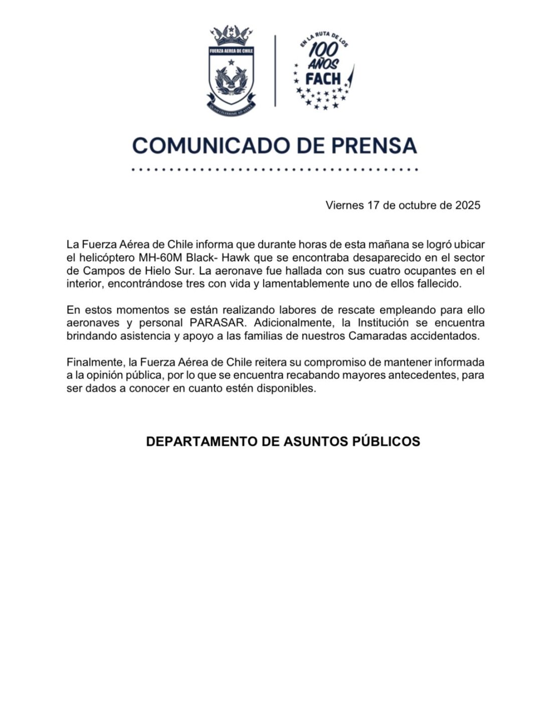 Cabe recordar que la noche del jueves la Fuerza Aérea de Chile informó que se perdió contacto con la nave en el sector refugio Eduardo García Soto, ubicado en Campos de Hielo Sur, Región de Aysén.