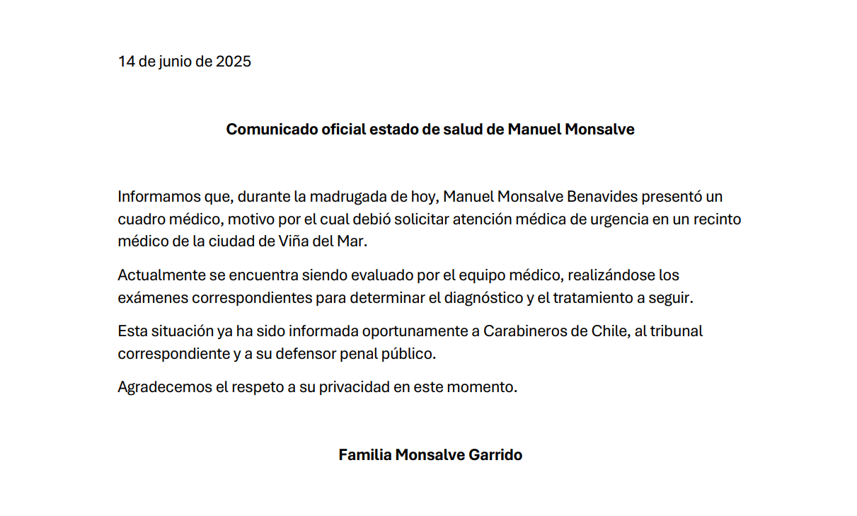 "Informamos que, durante la madrugada de hoy, Manuel Monsalve Benavides presentó un cuadro médico, motivo por el cual debió solicitar atención médica de urgencia", señaló la familia del ex subsecretario a través de un comunicado.
