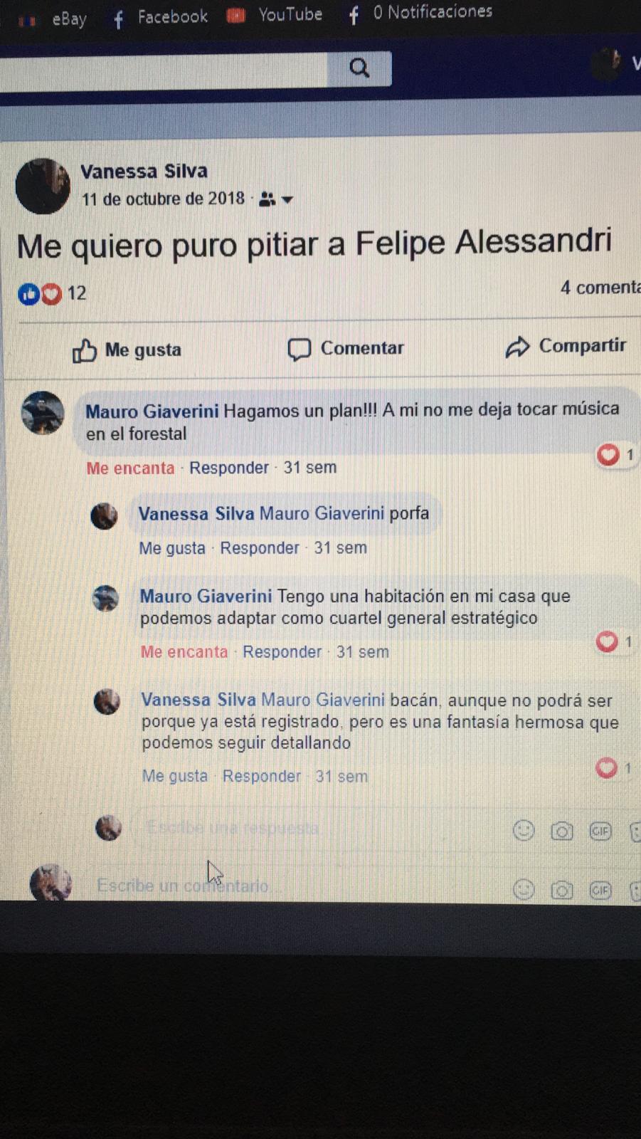A lo anterior se suma un nuevo episodio: este jueves se conoció que el líder comunal presentó una denuncia contra Vanessa Silva, de 31 años y actriz de profesión, debido a un mensaje que publicó en sus redes sociales el 11 de octubre del año pasado, que decía: “Me quiero puro pitiar a Felipe Alessandri”.