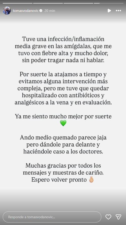 "Ya me siento mucho mejor por suerte. Ando medio quemado parece jaja, pero dándole para delante y haciéndole caso a los doctores", agregó.