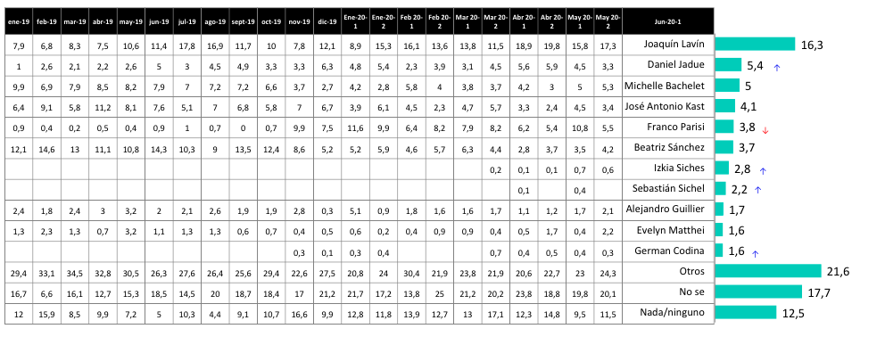 El alcalde de Las Condes, Joaquín Lavín, es quien se mantiene en primer lugar con un 16,3% de las preferencias, seguido por su par de Recoleta, Daniel Jadue, quien obtuvo un 5,4% y Michelle Bachelet con un 5,0%.