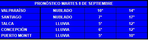Rachas de 70 kilómetros por hora con precipitaciones de diversa intensidad afectarán el centro y sur de Chile este martes 8 de septiembre. Y, ¿cómo estará el tiempo para Fiestas Patrias? Hay novedades, te las contamos.