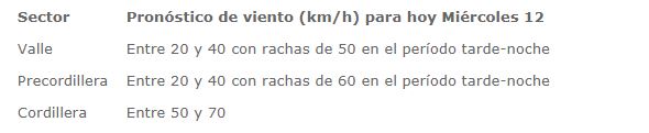 En detalle, se esperan que para este miércoles la presencia de viento normal a moderado que afectarán al valle y la precordillera de la capital con rachas de vientos entre 20 y 40 kilómetros.