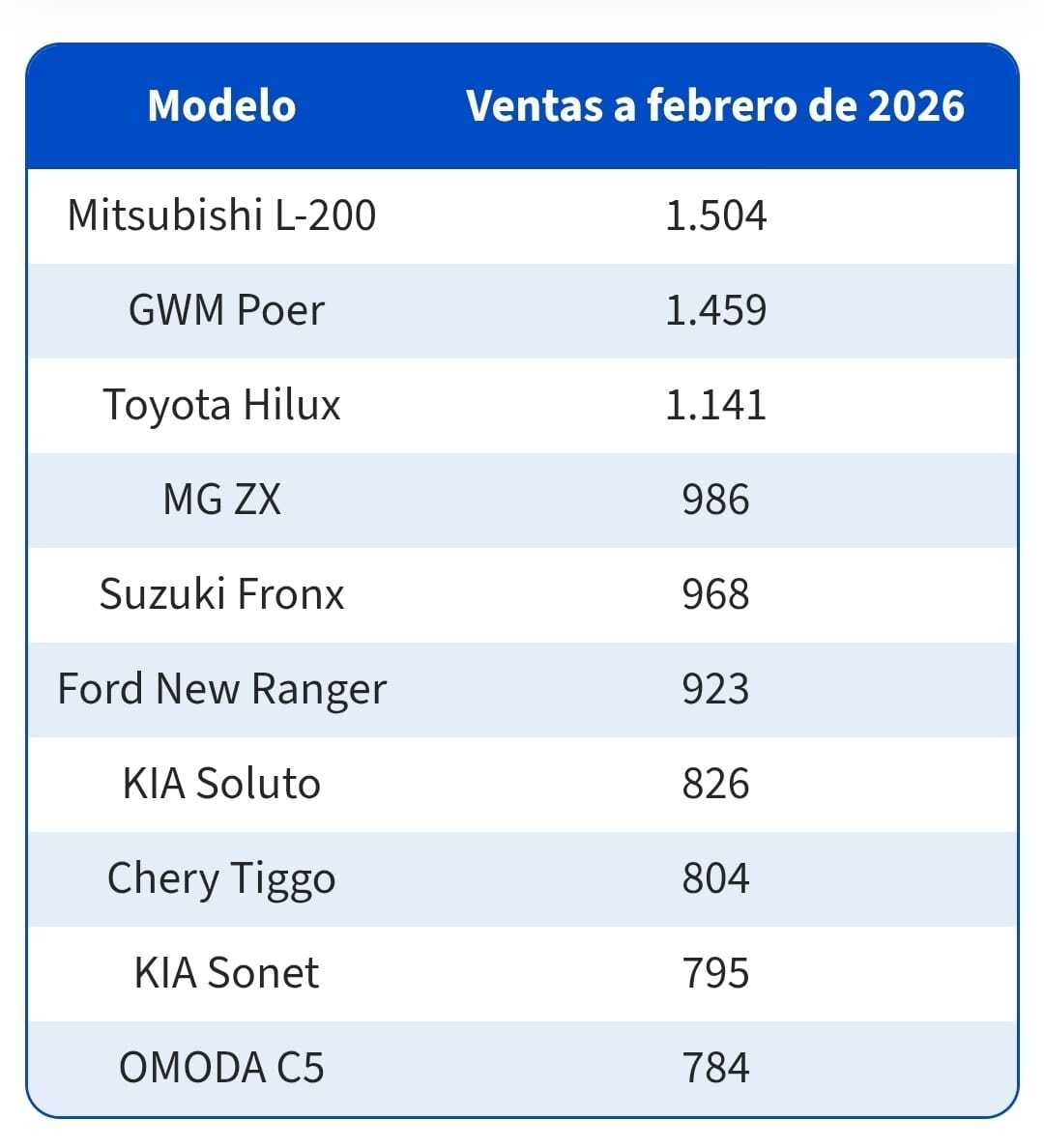 De acuerdo con los datos entregados por la Asociación Nacional Automotriz de Chile (ANAC), recogidos la plataforma Autofact, los modelos de autos más vendidos en el país hasta febrero del 2026 son:
