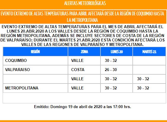 La Dirección Meteorológica de Chile emitió una alerta por un evento de altas temperaturas que se desarrollará entre las regiones de Coquimbo y Metropolitana este lunes y martes.