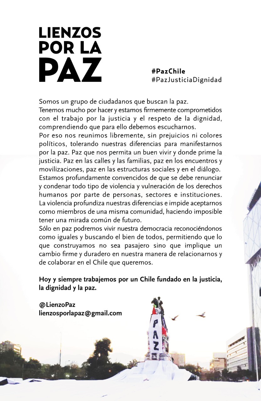 Tal como ocurrió el pasado viernes 15 de noviembre en Plaza Italia, donde un grupo de personas instaló en distintas ciudades del país lo que ha sido denominado como "lienzo por la paz", esta iniciativa ha sido llevada a cabo en diversas plazas y puntos emblemáticos de ciudades a los largo de Chile.