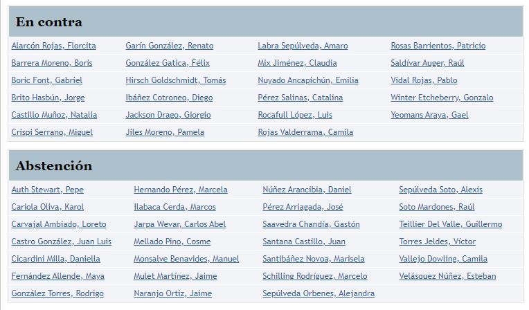 Los diputados que optaron por la negativa a la iniciativa pertenecen a distintos partidos de oposición: 18 forman parte del Frente Amplio (FA), como Gabriel Boric, Florcita Motuda, Giorgio Jackson, Pamela Jiles y Gael Yeomans, mientras que otros 3 son del Partido Socialista (PS) y 2 del Partido Comunista (PC).