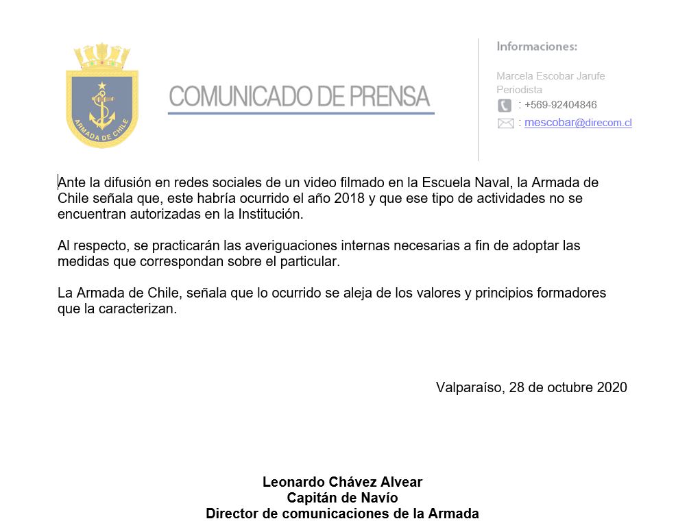 Desde la Armada indicaron que "ante la difusión en redes sociales de un video filmado en la Escuela Naval, la Armada de Chile señala que, este habría ocurrido el año 2018 y que ese tipo de actividades no se encuentran autorizadas en la institución".