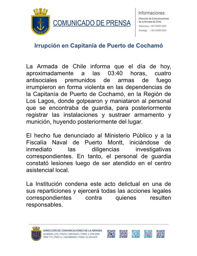 De acuerdo a lo que se informó, el robo ya fue denunciado al Ministerio Público y a la Fiscalía Naval de Puerto Montt, "iniciándose de inmediato las diligencias investigativas correspondientes".