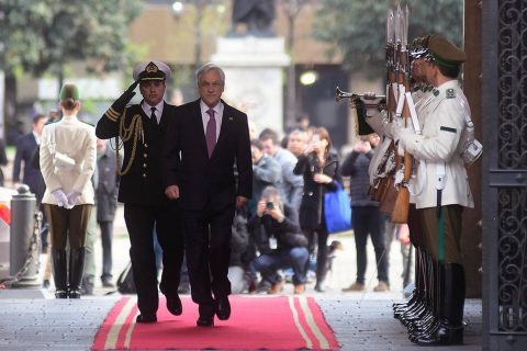 El presidente Piñera llega a La Moneda junto a su edecán para seguir los detalles del fallo desde palacio