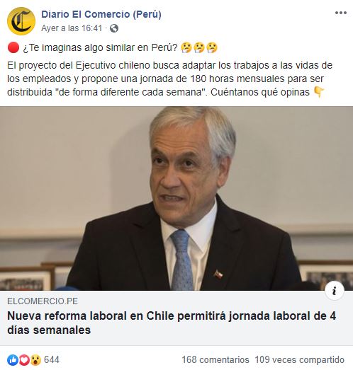 En otros países que se discutió este punto fue en Bolivia, donde El Deber habló de la "nueva reforma laboral en Chile permitirá jornada laboral de 4 días semanales".