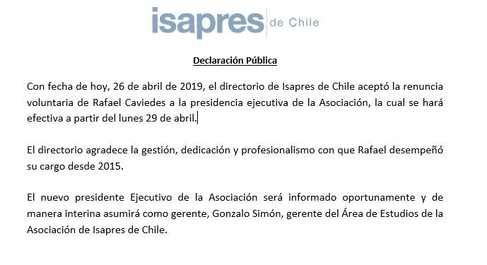 Esta tarde desde el directorio de Isapres de Chile anunciaron que aceptaron la renuncia voluntaria de Rafael Caviedes a la presidencia ejecutiva de la asociación.